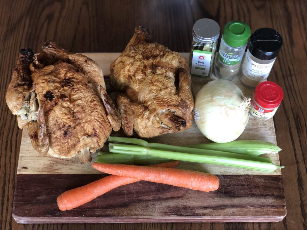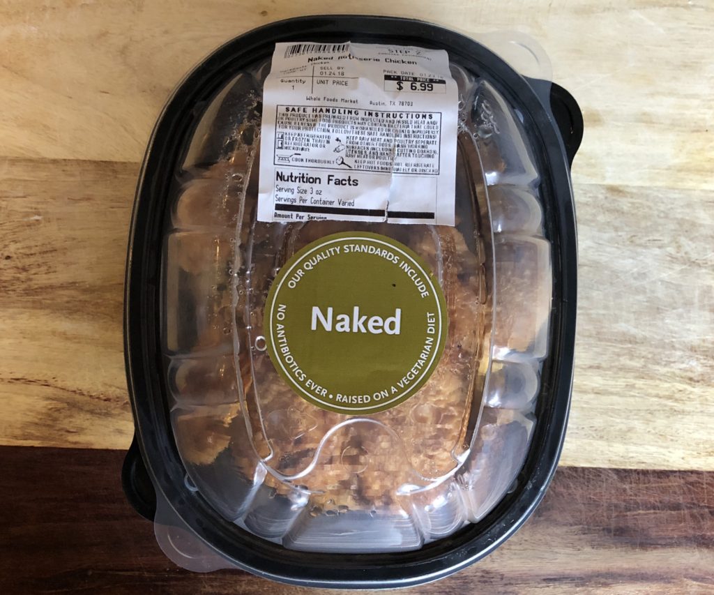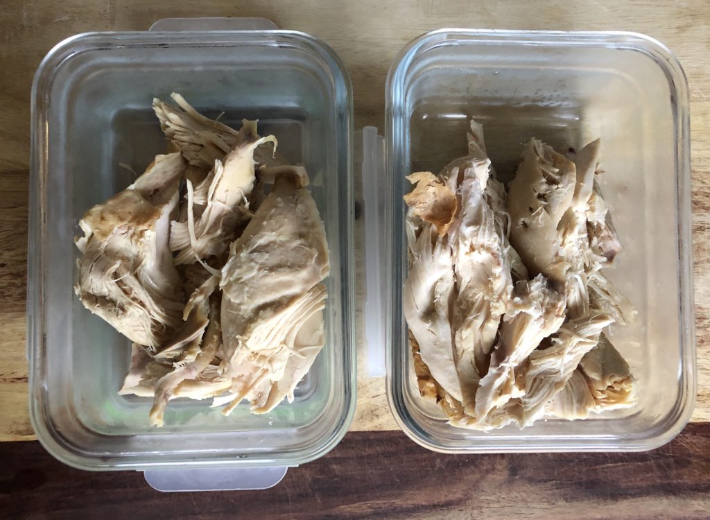 I start with two whole rotisserie chickens. I use the naked chicken from Whole Foods Market because they do not add any seasoning or other ingredients, just chicken.