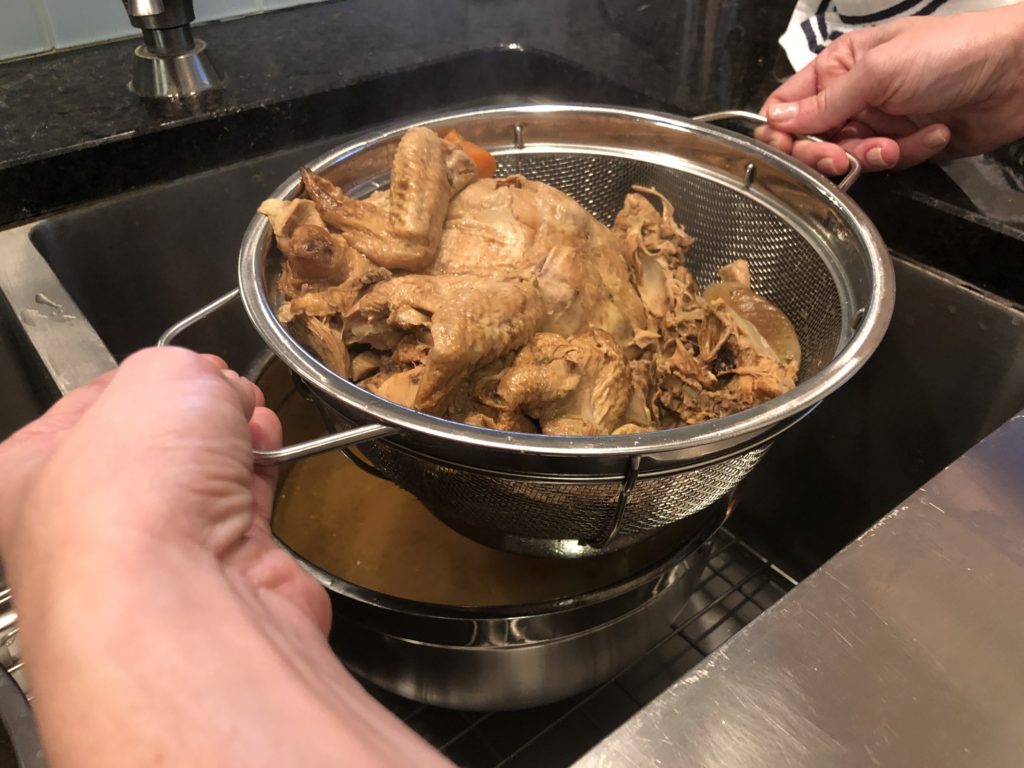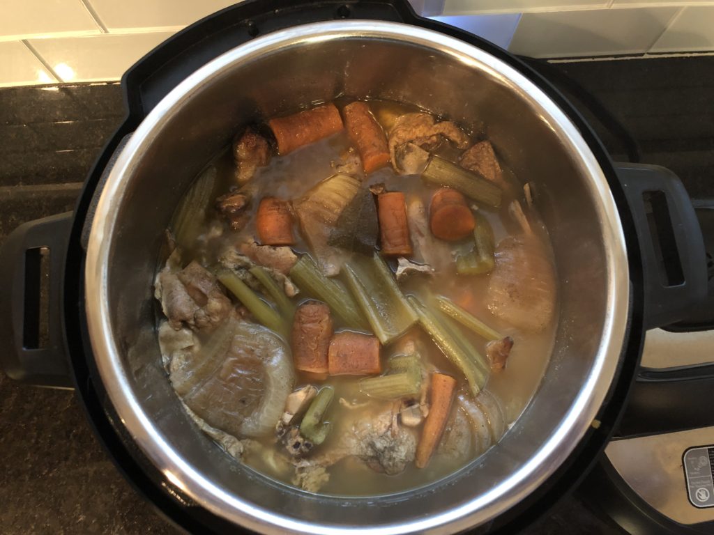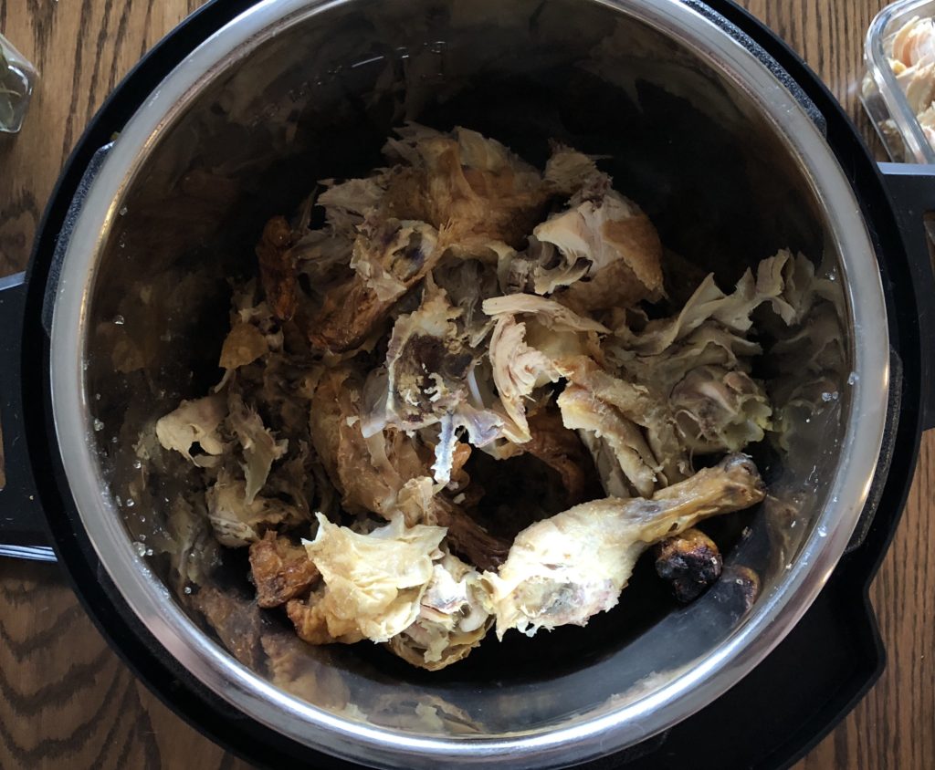 After the majority of the meat is off of the bones, I start the quick layering process in the instant pot. Place the bones from both chickens in the instant pot.
