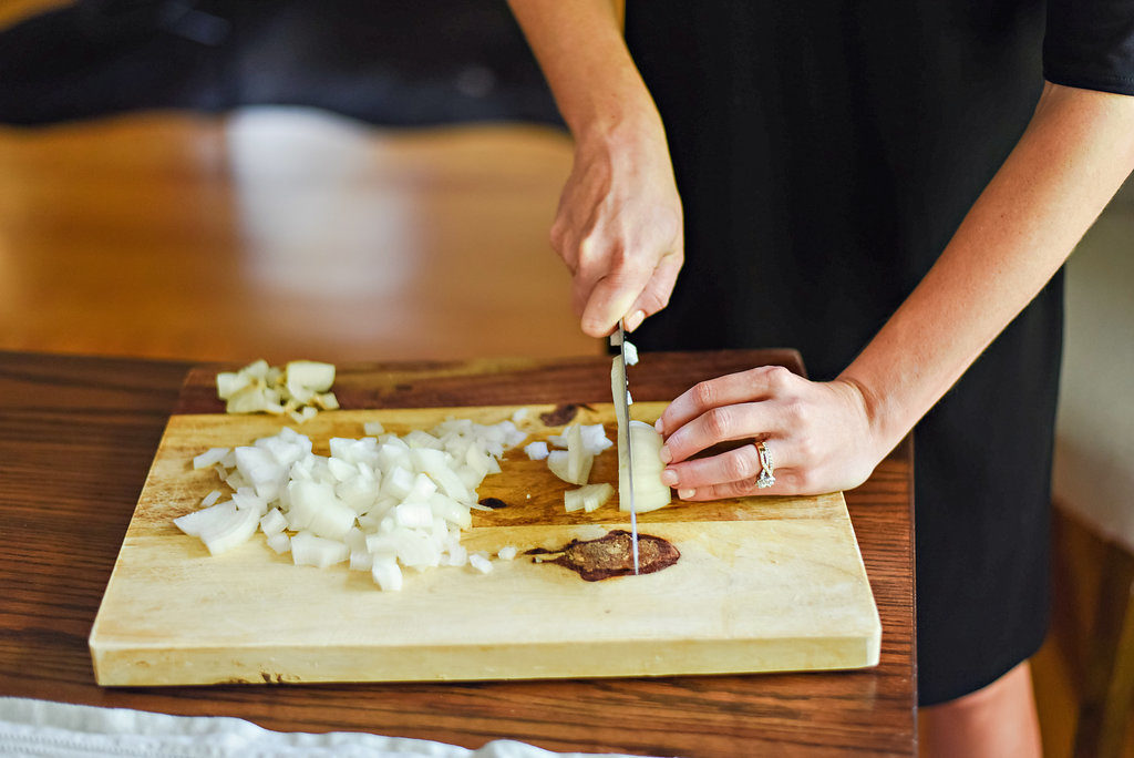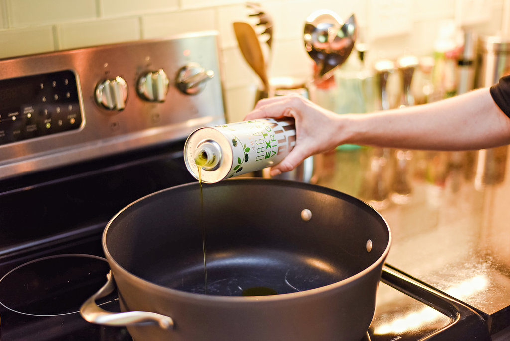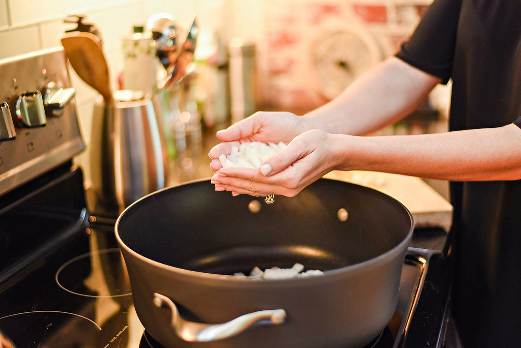 Next, add a tablespoon of extra virgin olive oil to a large pot and then add a chopped sweet onion.