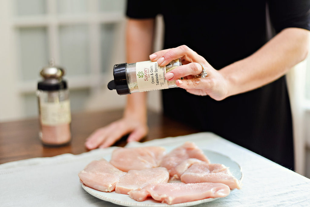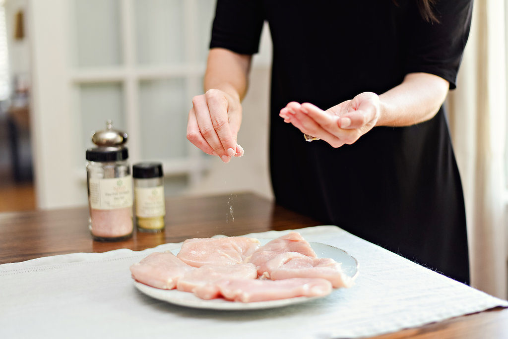 Start off with six chicken breasts, this meal is great for sharing and heats up really well as left overs if you aren't feeding a crowd! Season the chicken on both sides with salt and garlic powder.