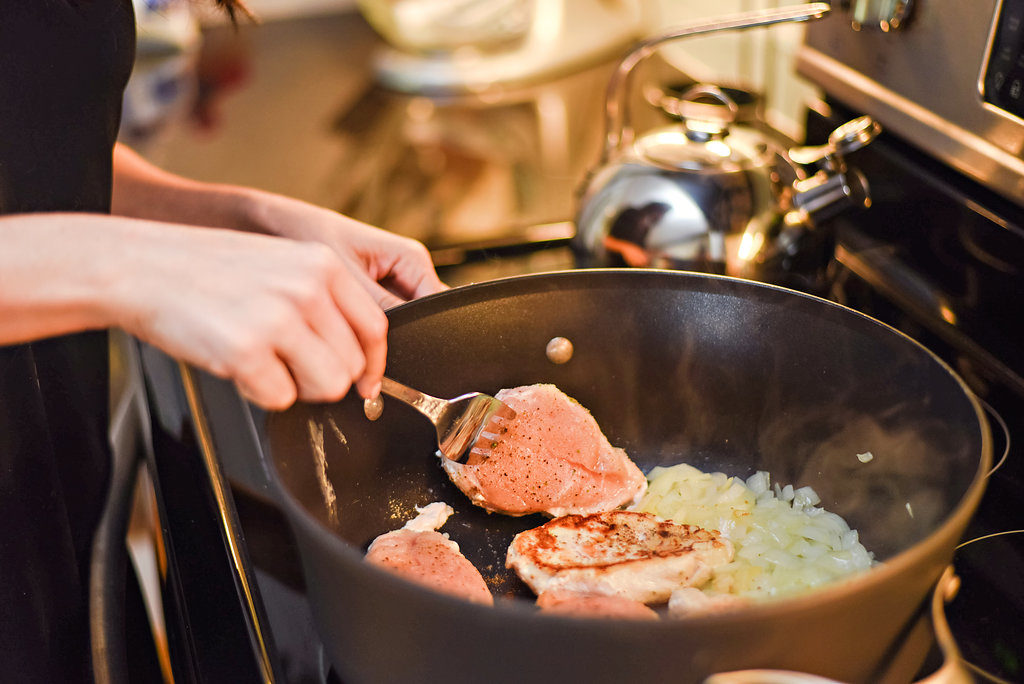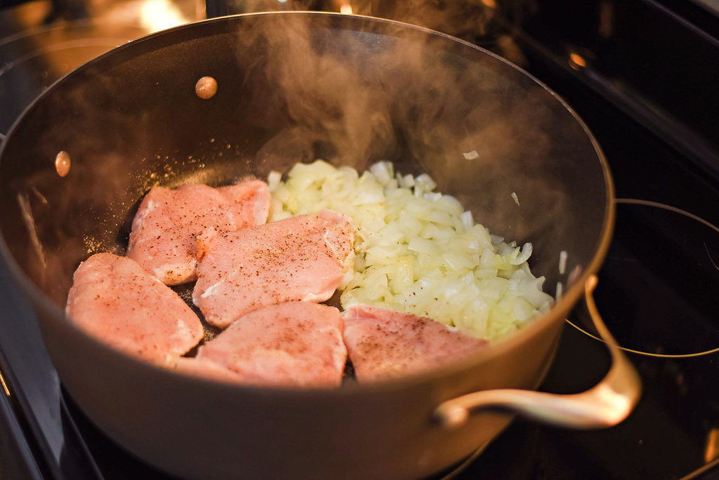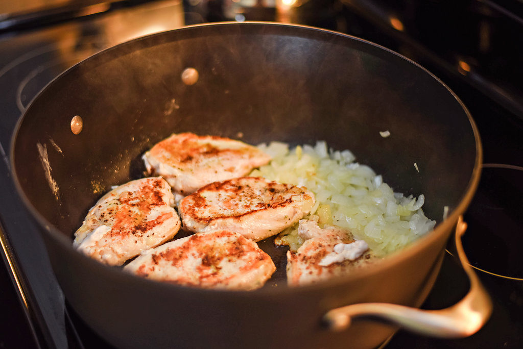 After the onions become fragrant and translucent (about five minutes) add the chicken so that it can brown on both sides.