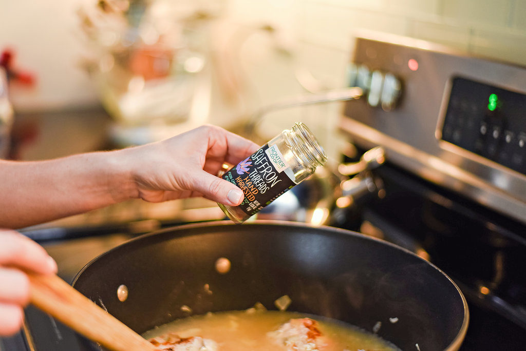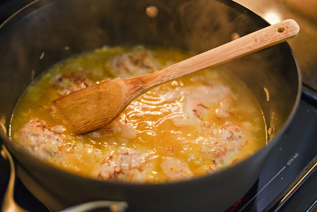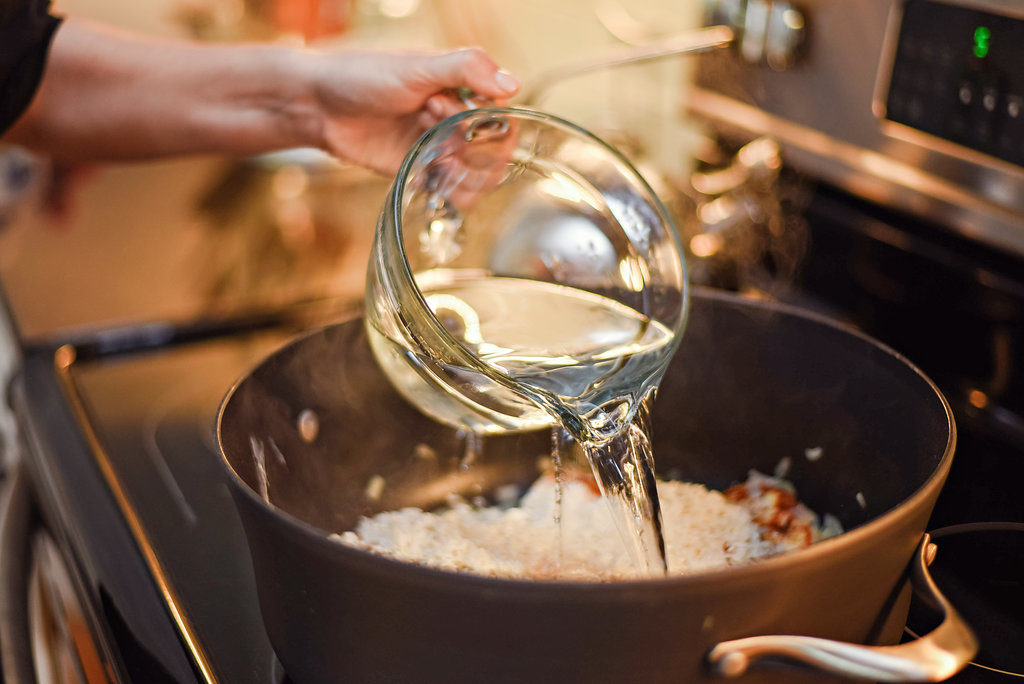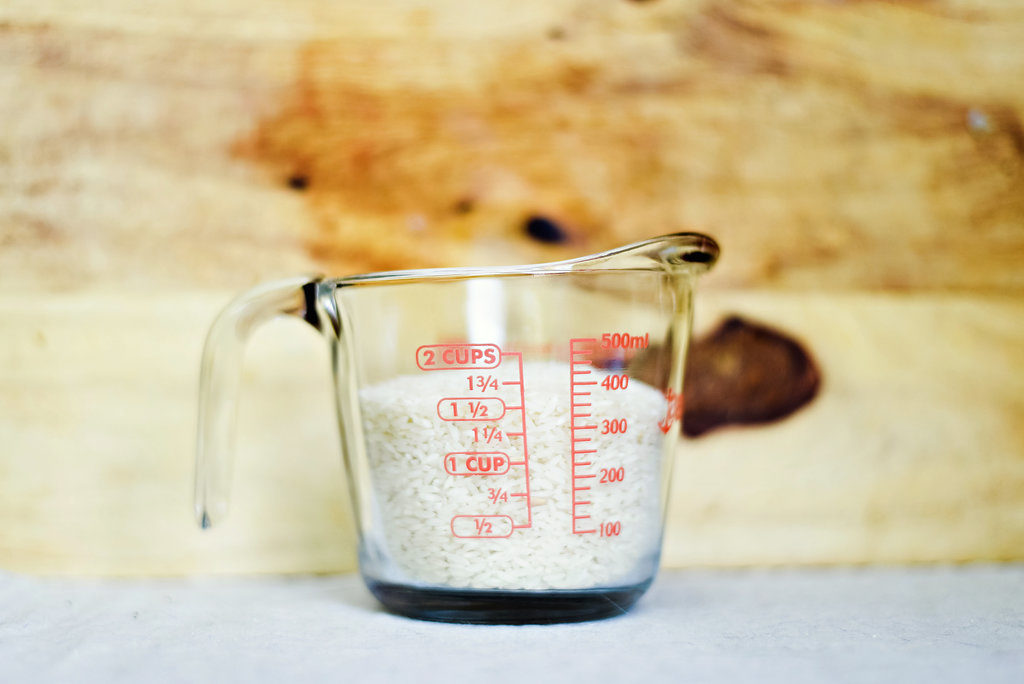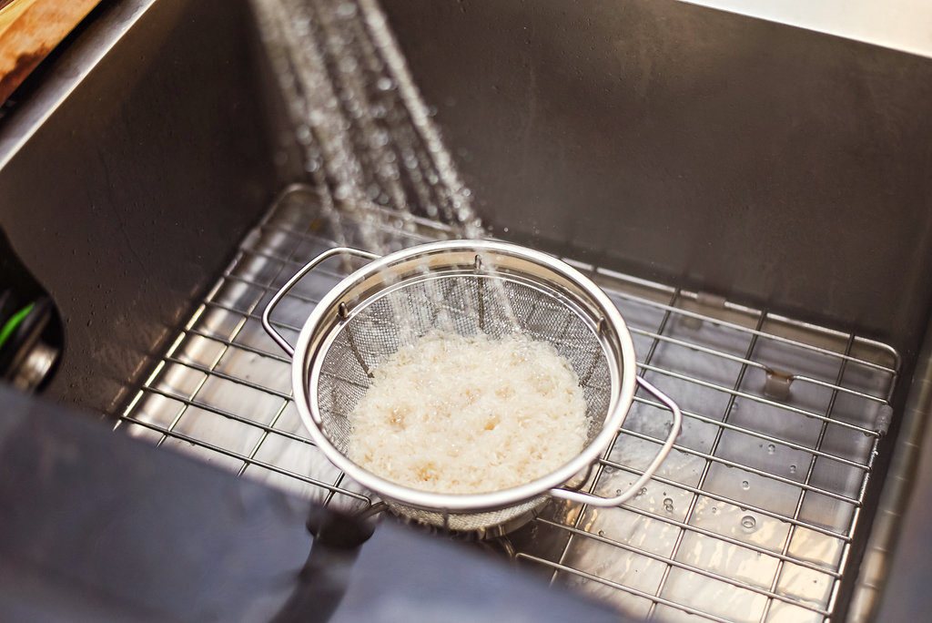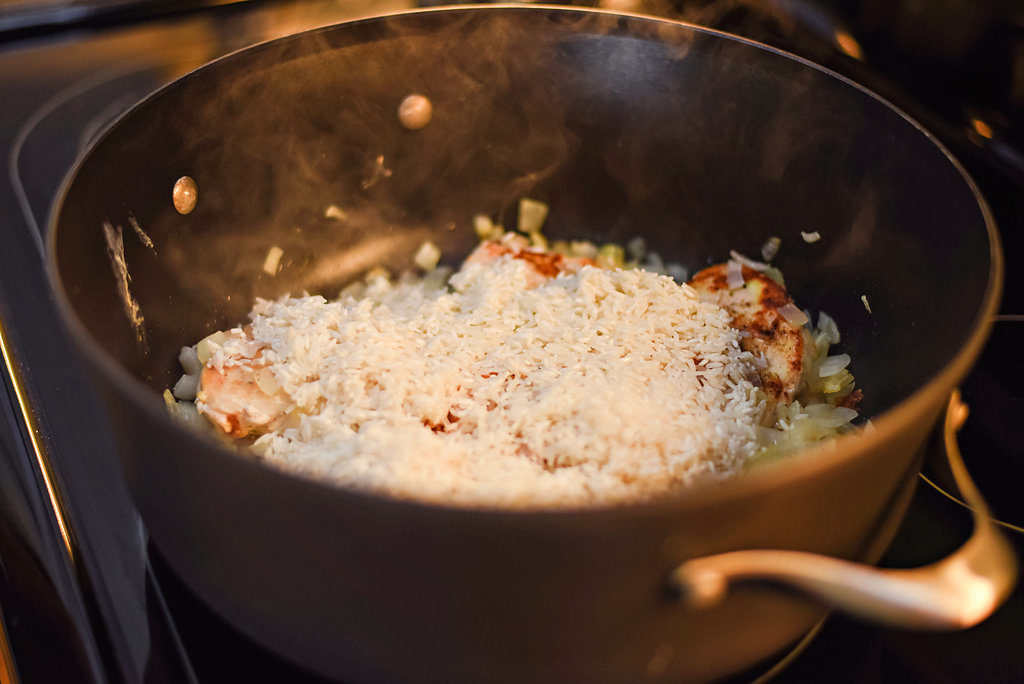 While the chicken is browning, measure out 1.5 cups of plain white rice and rinse it with water.
