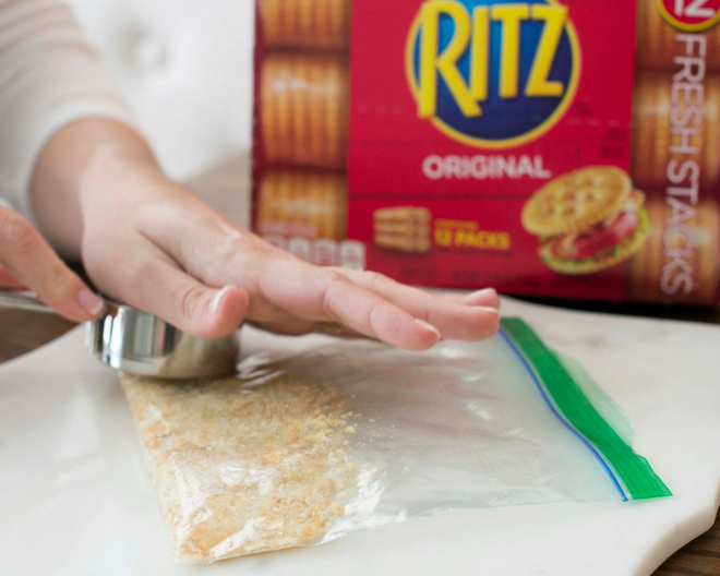 Next, smash 12 RITZ Crackers in a plastic bag. Then add them to the ground beef.