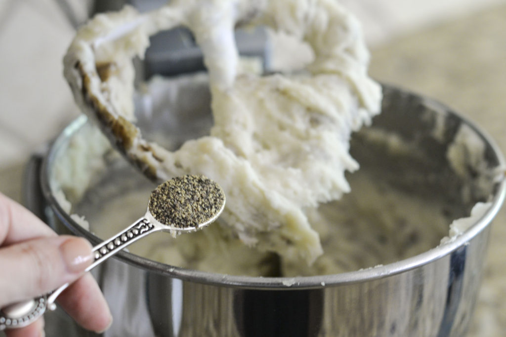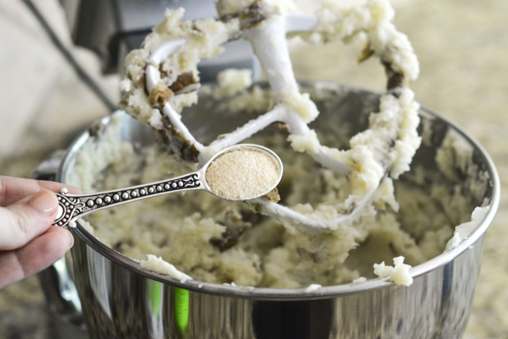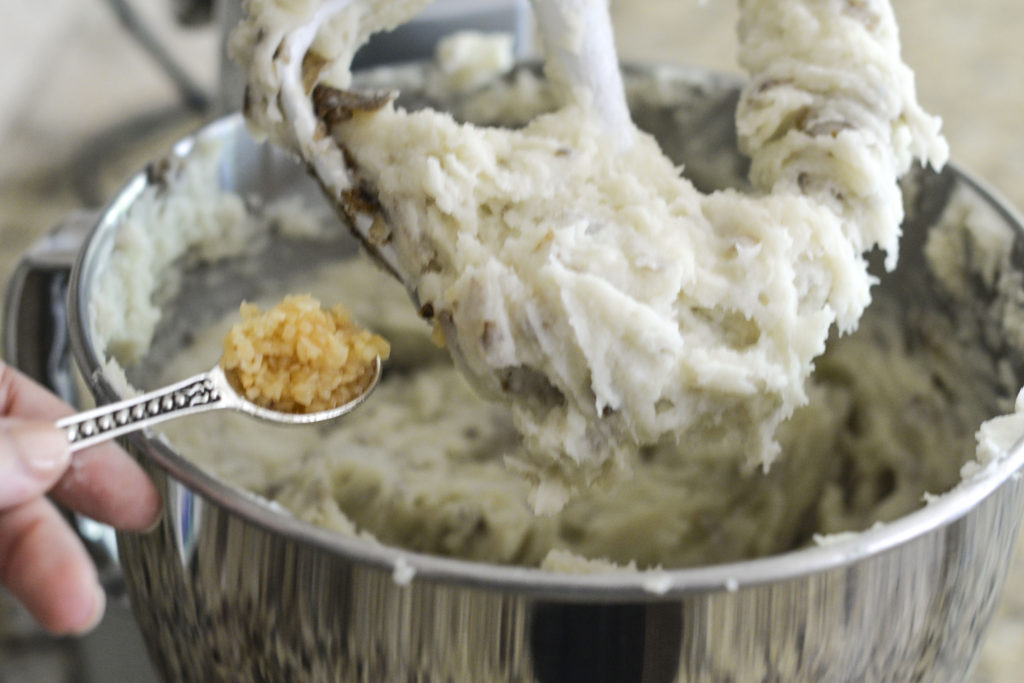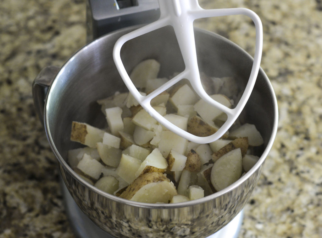 After you drain the potatoes, the easiest way to get all of the yummy parts mixed evenly is by transferring them to a stand mixer.