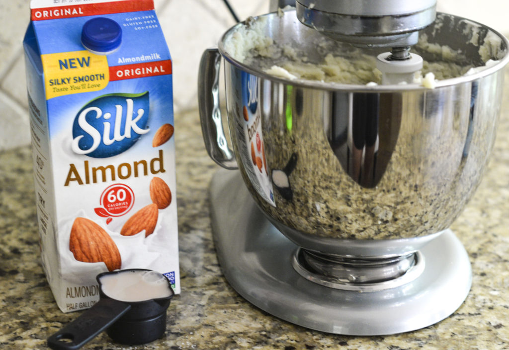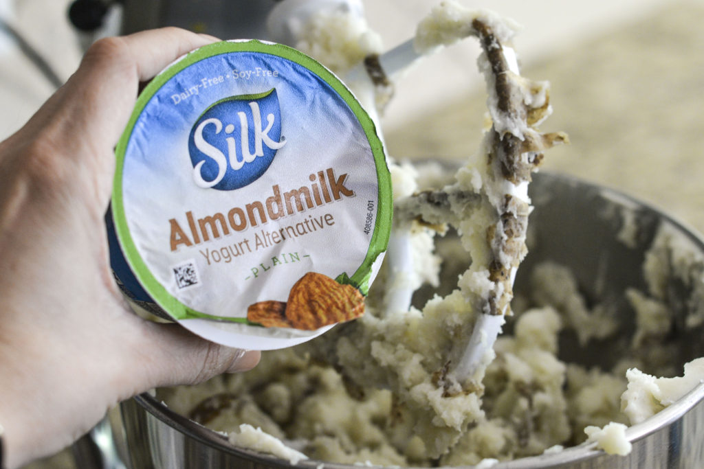 First, add 1 and 1/4 cups or two 5.3 oz containers of Silk Plain Almond Dairy-Free Yogurt Alternative.