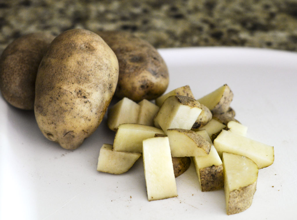 While the water heats, wash and chop the potatoes into one inch cubes.
